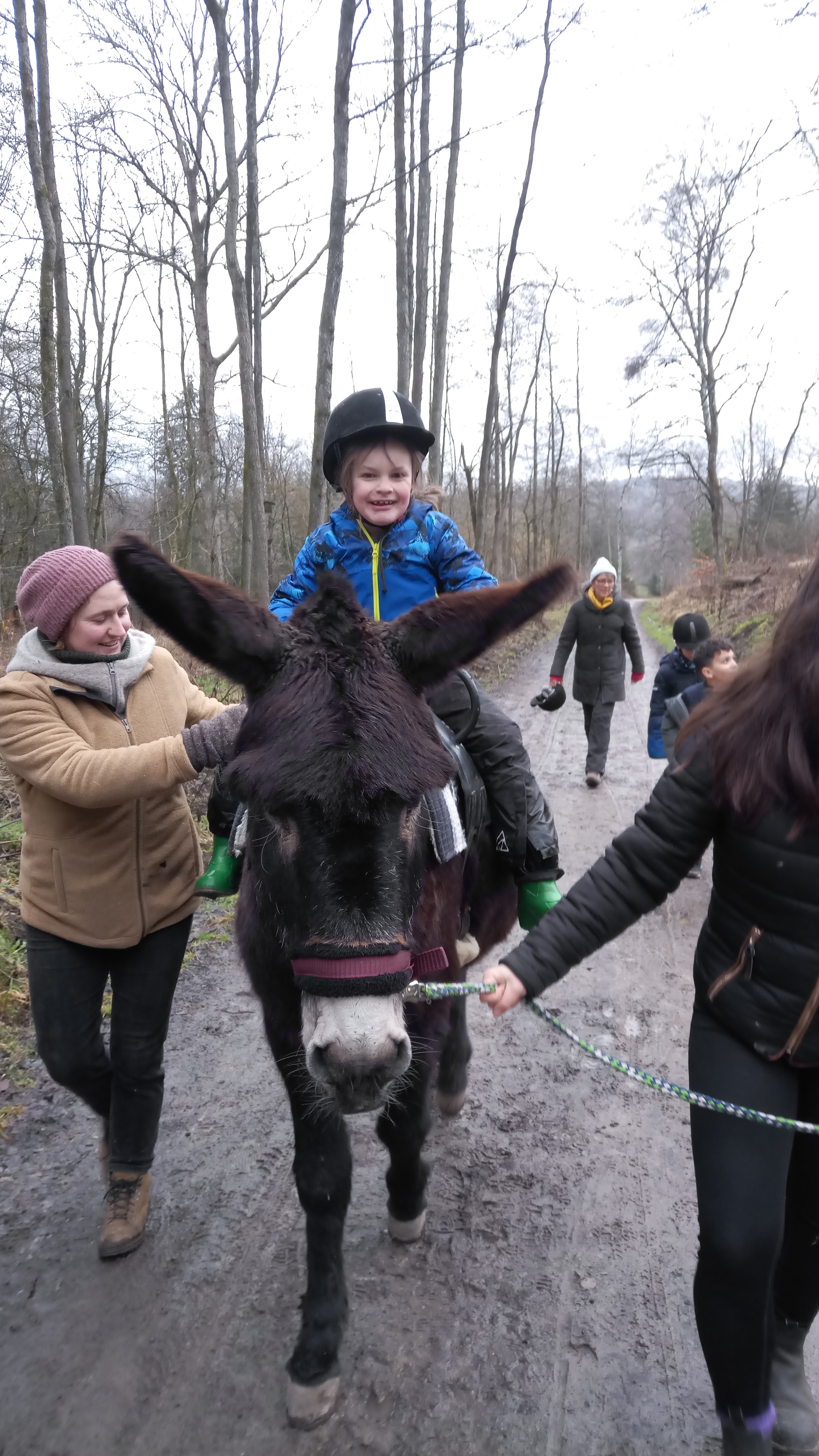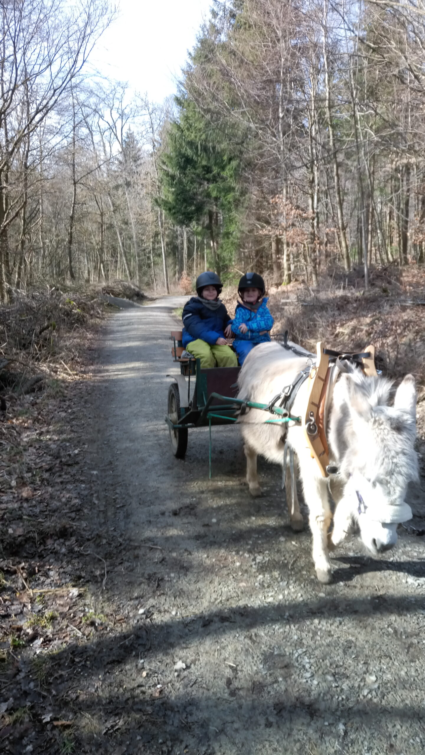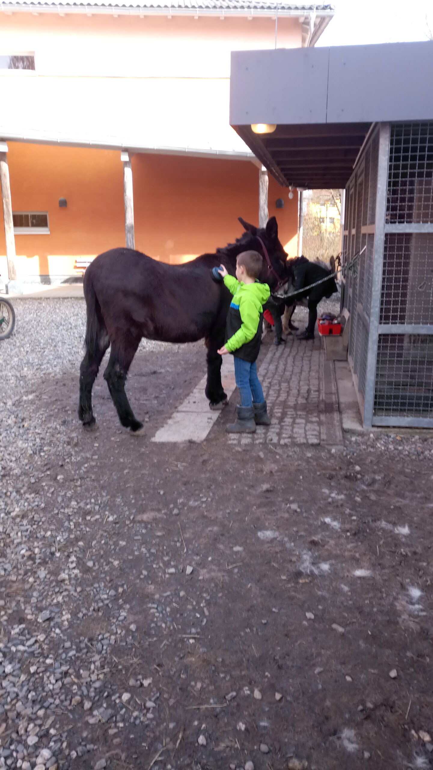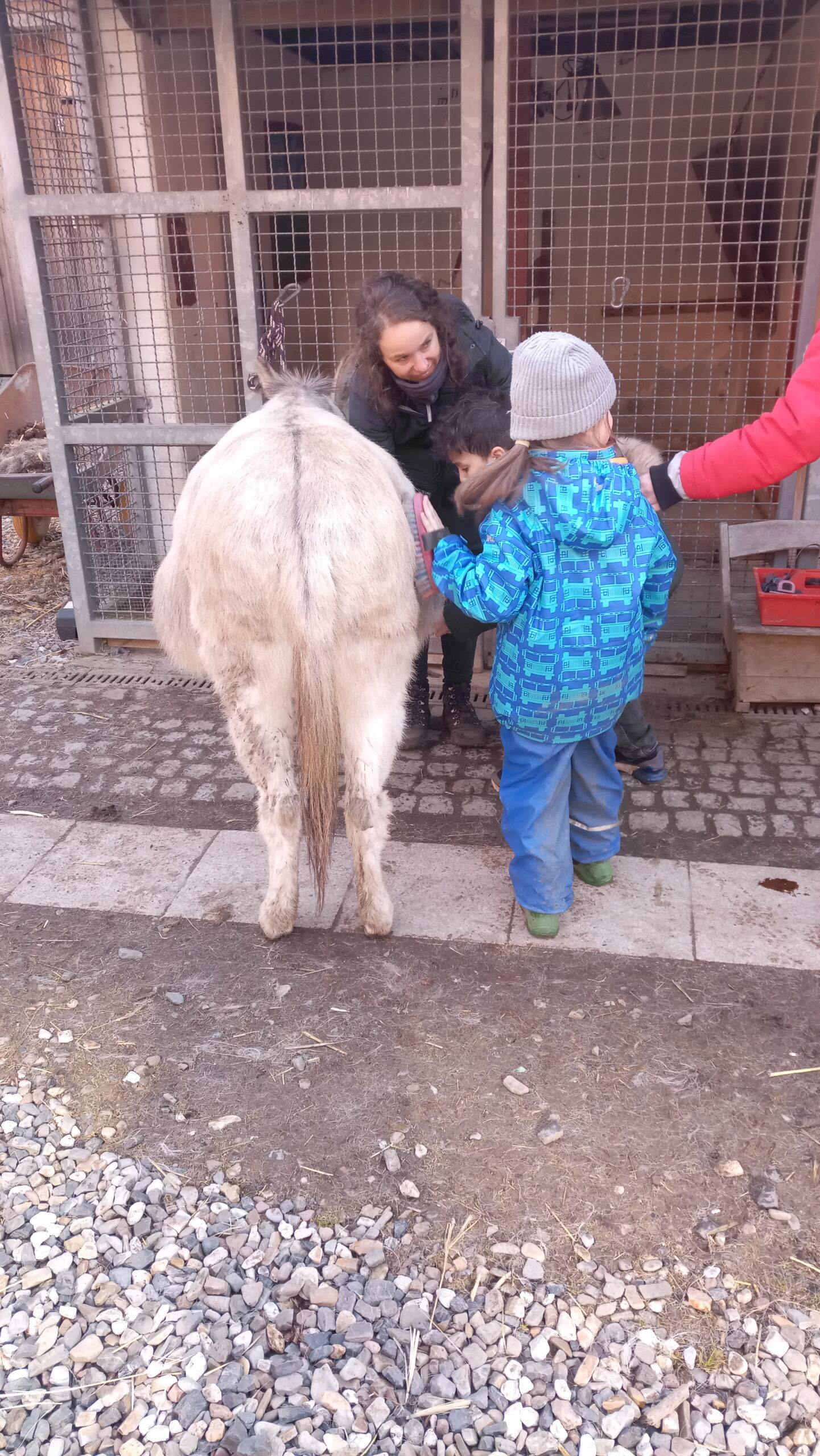 „Derzeit besuchen wir jeden Freitag das Tierprojekt. Durch die Regelmäßigkeit und die große Begeisterung der Kinder ist es zu einem wichtigen Bestandteil des Schulalltags geworden. Die Kinder fragen täglich, wann wir wieder zum Bauernhof gehen und freuen sich immer schon auf Freitag („unseren blauen Tag“ – da die Tage bei uns nach Farben benannt sind) und erwarten schon gespannt, was kommt. Fast alle Kinder haben mittlerweile den Mut gefasst und sind schon auf Esel oder Pferd geritten. Aber auch die Schafherde, mit der wir schon einige Spaziergänge machen durften ist sehr beliebt. Der feste Rhythmus des Tierprojekts, erst werden in Gruppen die Tiere versorgt (Füttern, Putzen und Ställe ausmisten) und danach findet eine Gruppenaktivität statt (Spaziergang mit den Tieren, Reiten, Kutschfahrt o.ä.), sorgt dafür, dass die Kinder Sicherheit an diesem neuen Ort gefunden haben.“