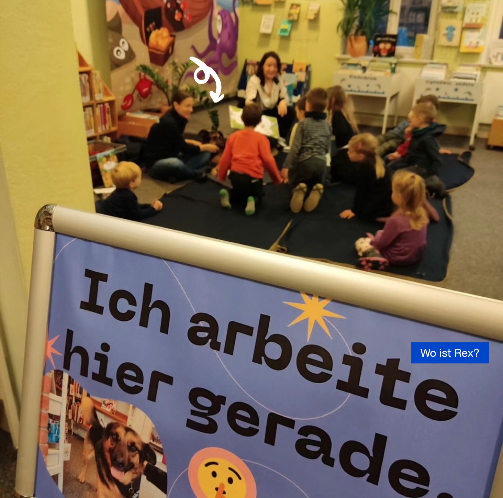 Donnerstag, den 23.11. war Lesehund Rex zu Gast in der Stadtbibliothek 📚 Rotenburg. Eintauchen ins Abenteuer war geplant. 13 Kinder 👩👦👦👨👦👦👨👧👦im Alter zwischen vier und acht kamen mit ihren Eltern, die dann alle geduldig im Vorraum warteten, während Rex 🐾 mit seinem Frauchen Eva-Maria Backhaus die Kinder fürs 📖Lesen und Hundesprache 🐕 begeisterte.