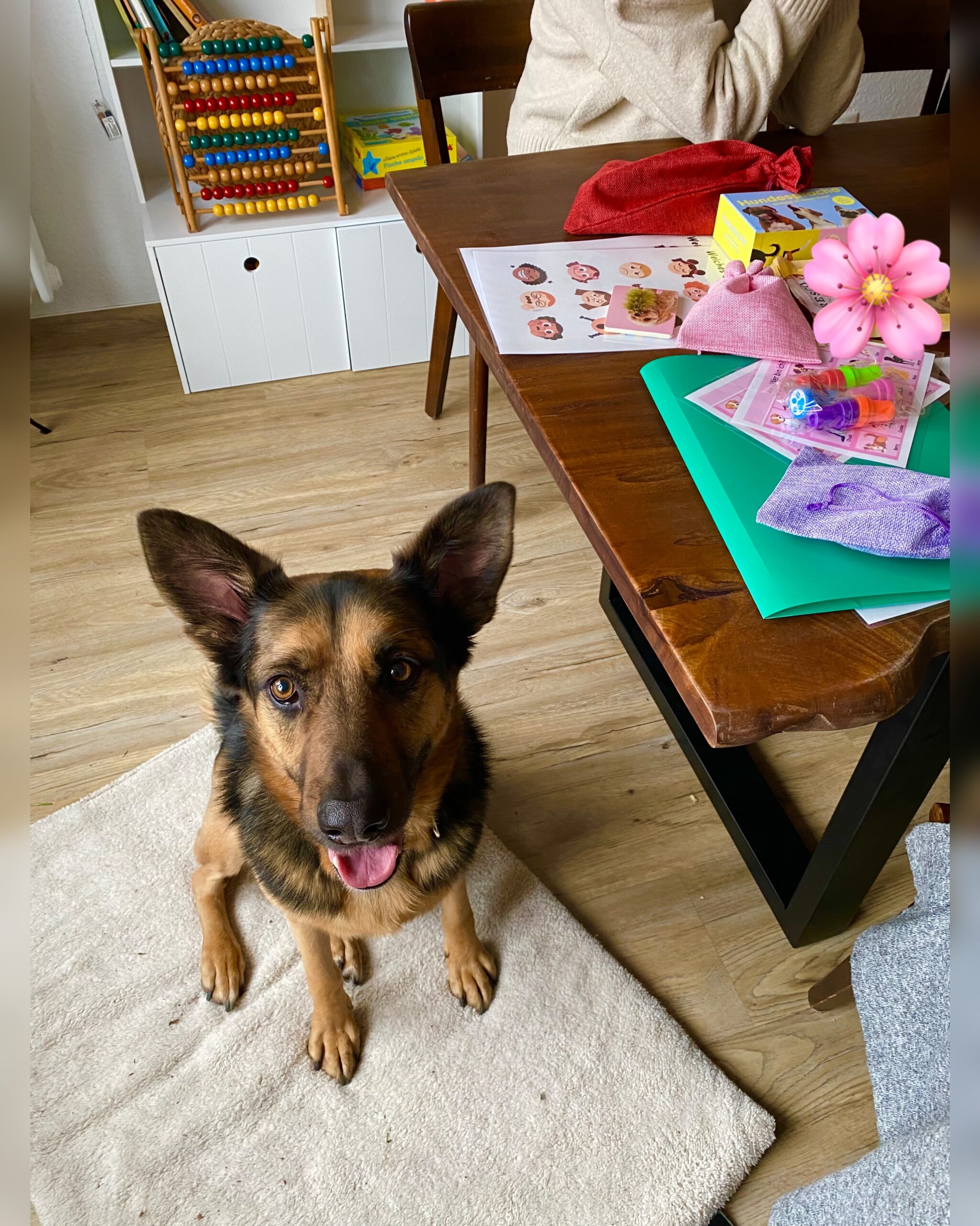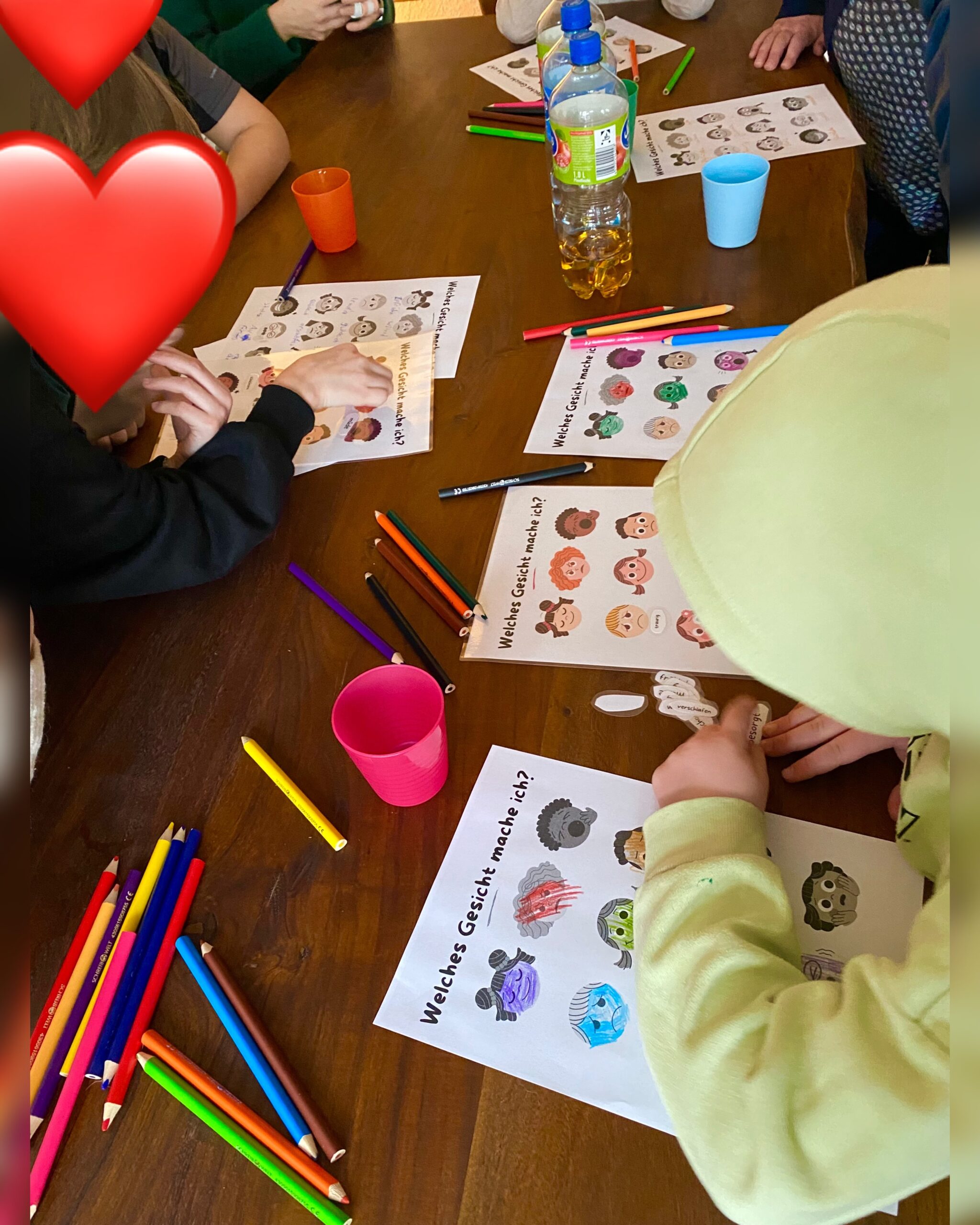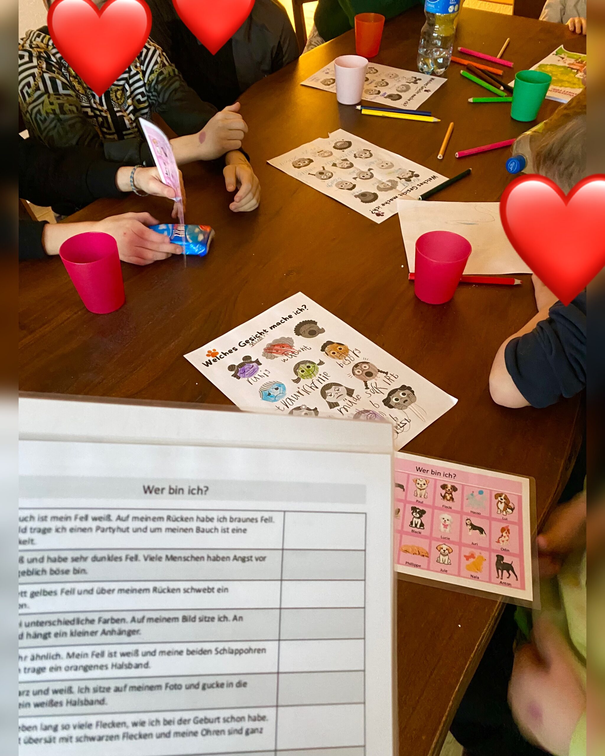 Pünktlich um 15:30 Uhr ⏰ starteten beide mit den sechs ❤️ Kindern. Das Thema diesmal: Welche Gefühle 🥹😎😡😳😱kann ein Kind mit dem Gesicht ausdrücken, und wie sehen diese Gefühle / Mimik bei einem 🐶Hund aus? Dazu hatte Eva-Maria verschiedene Gesichter dabei, die zunächst einzeln und dann in der Gruppe 💬 besprochen wurden. Nach einer Pause ging es weiter mit „Wer bin ich?“, bei dem Fragen