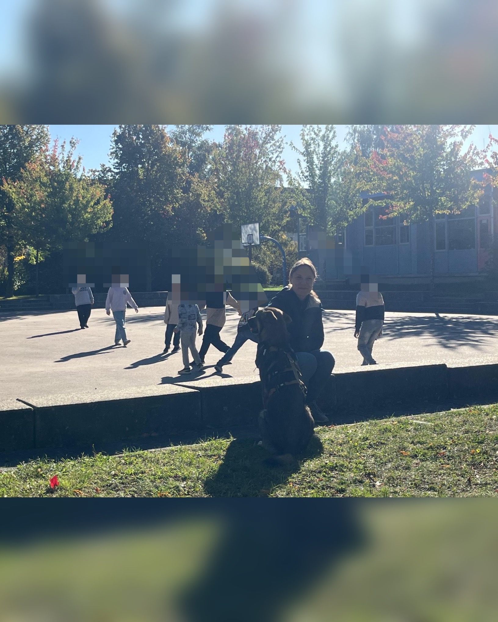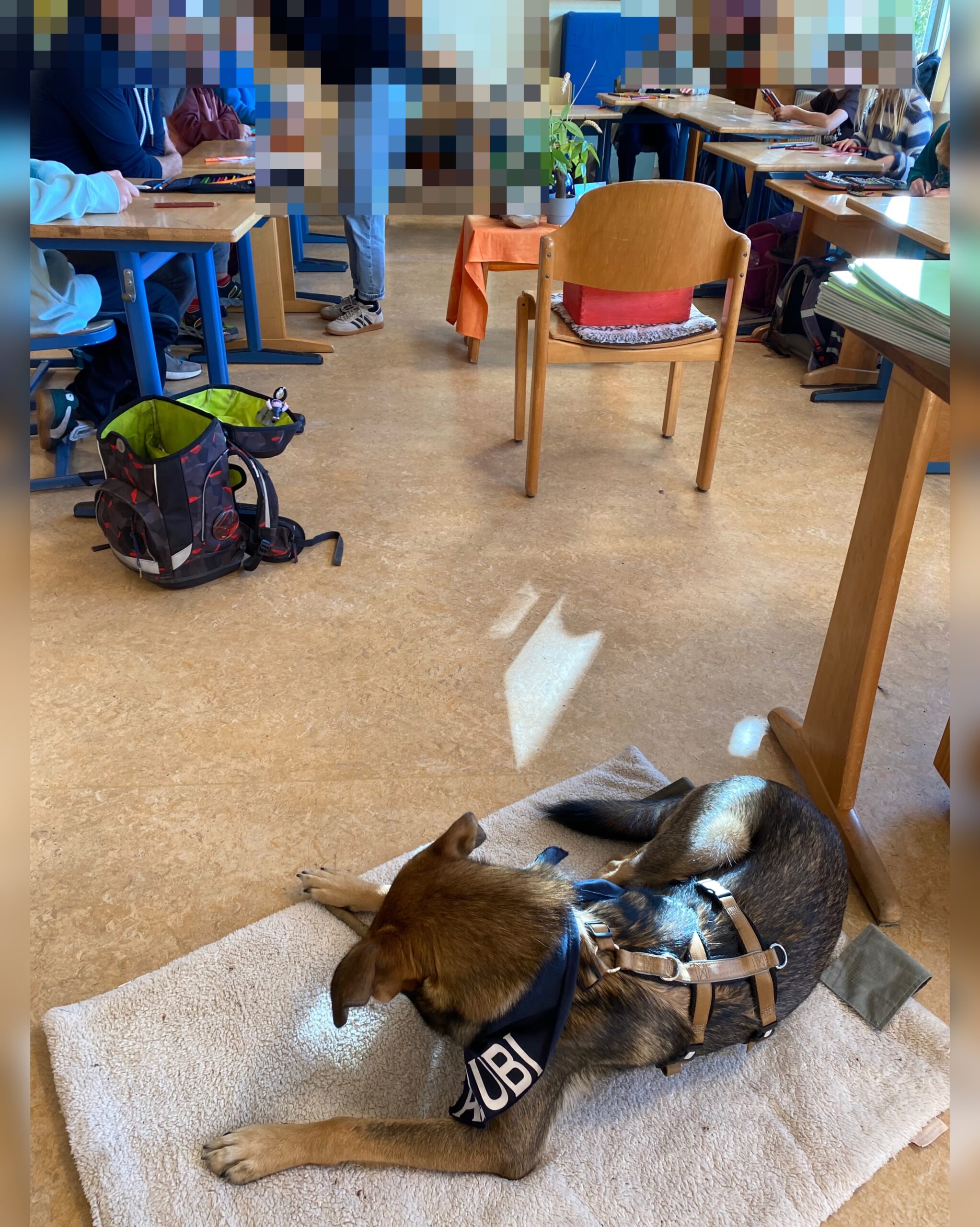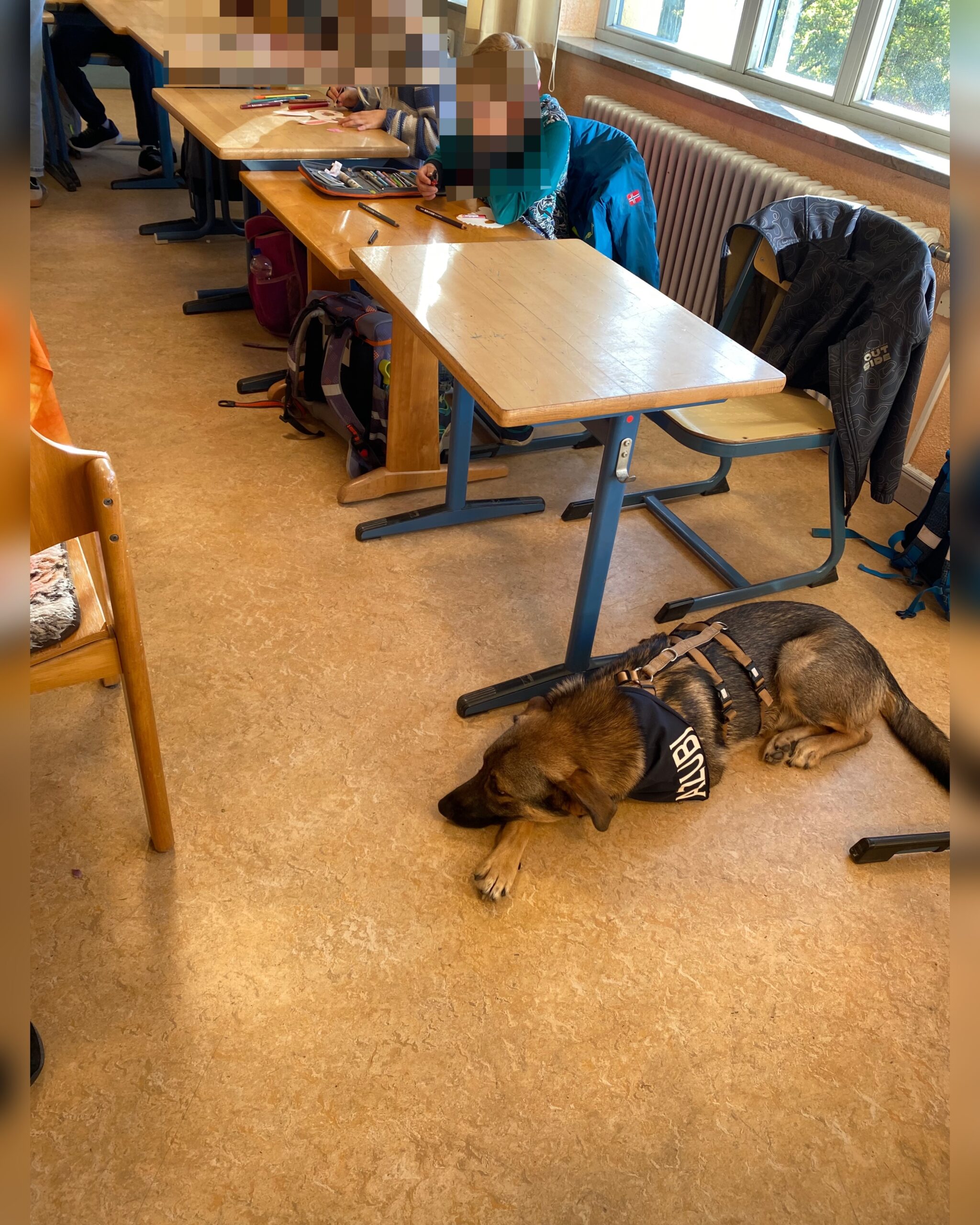 Am darauf folgenden Tag ging es gleich frisch und munter in die Schule, wo Samy auch seine Decke mitbrachte. Dank der tollen Vorbereitung durch ihren Klassenlehrer wussten die Kinder schon Bescheid über die Hunderegeln, sodass Samy sich sofort wohl fühlte und sich entspannt niederließ. Währenddessen waren die Kinder kreativ am Werk und malten Tiermasken, die die Eva-Maria mitgebracht hatte. Doch die Zeit für den Abschied rückte näher, und wir hatten eine ganz besondere Überraschung für die Klasse: Sie durften die neuen Patenklasse für die zweite Klasse werden für das Projekt! Projektstart ist Januar 2026. Eine wunderbare Gelegenheit, den neuen Schülern ein Gefühl von Sicherheit und Orientierung zu bieten. Die Kinder sowie auch der Klassenlehrer und seine fachliche Assistentin erhielten eine kleine, feine Aufmerksamkeit.
