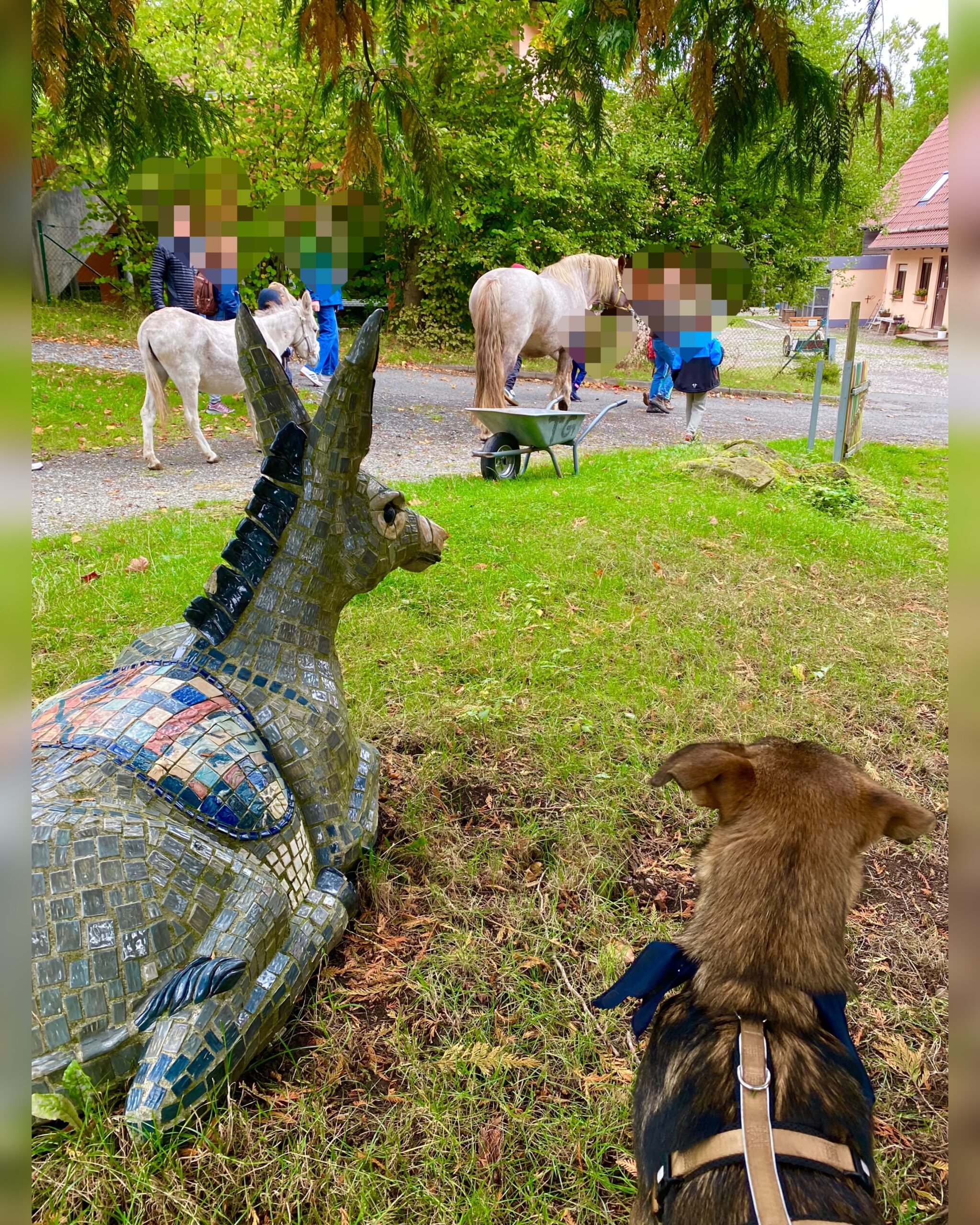 An diesem unvergleichlichen Tag luden wir auch die Eltern ein, um ihnen dieses berührende Erlebnis näherzubringen. Die Augen der Kinder funkelten vor Begeisterung, als sie ihren Eltern und Betreuern alles präsentieren durften. In dem sicheren und einladenden Bereich genossen wir ein gemeinsames Frühstück, und Samy, der kleine Wirbelwind, war mittendrin! Zum ersten Mal durfte er auf ganz besondere Weise mit Pferden und Eseln in Kontakt treten, auch wenn es erstmal durch die Zäune war. In aller Ruhe eroberte er die neue Umgebung und beobachtete aufmerksam das Geschehen um ihn herum – die Kinder beobachten ihn auch in Ruhe.