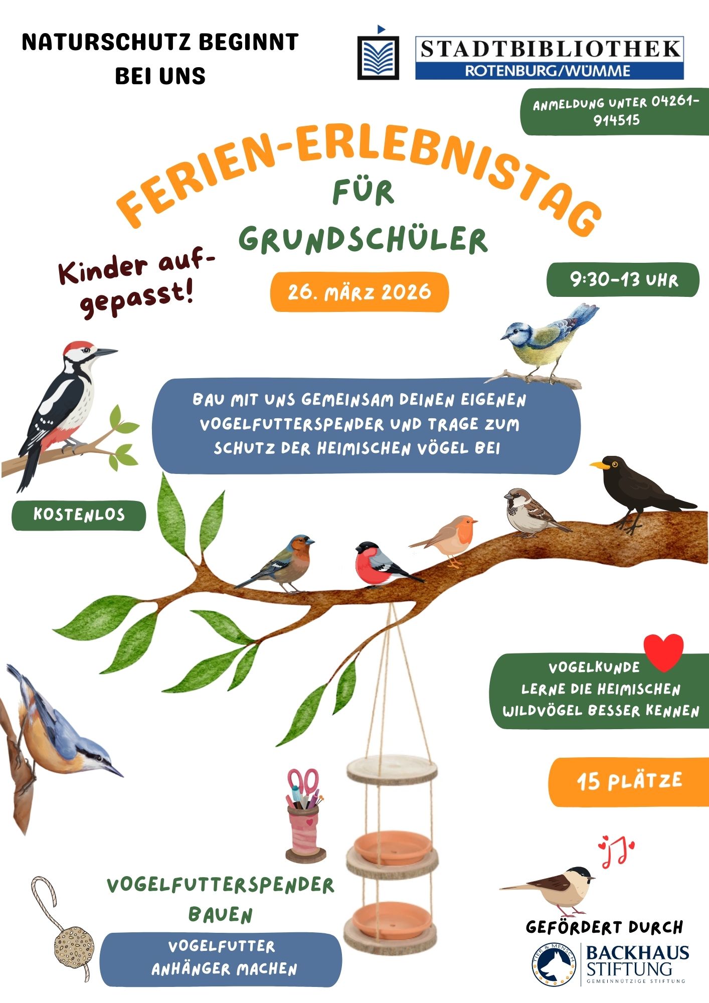 Am 26. März werden wir zusammen einen Vogelfutterspender 🐦🐧🪹bauen und leckeres Vogelfutter 💚 für unsere tierischen Freunde herstellen. Außerdem lernen wir die heimischen Wildvögel 🖼️ kennen!