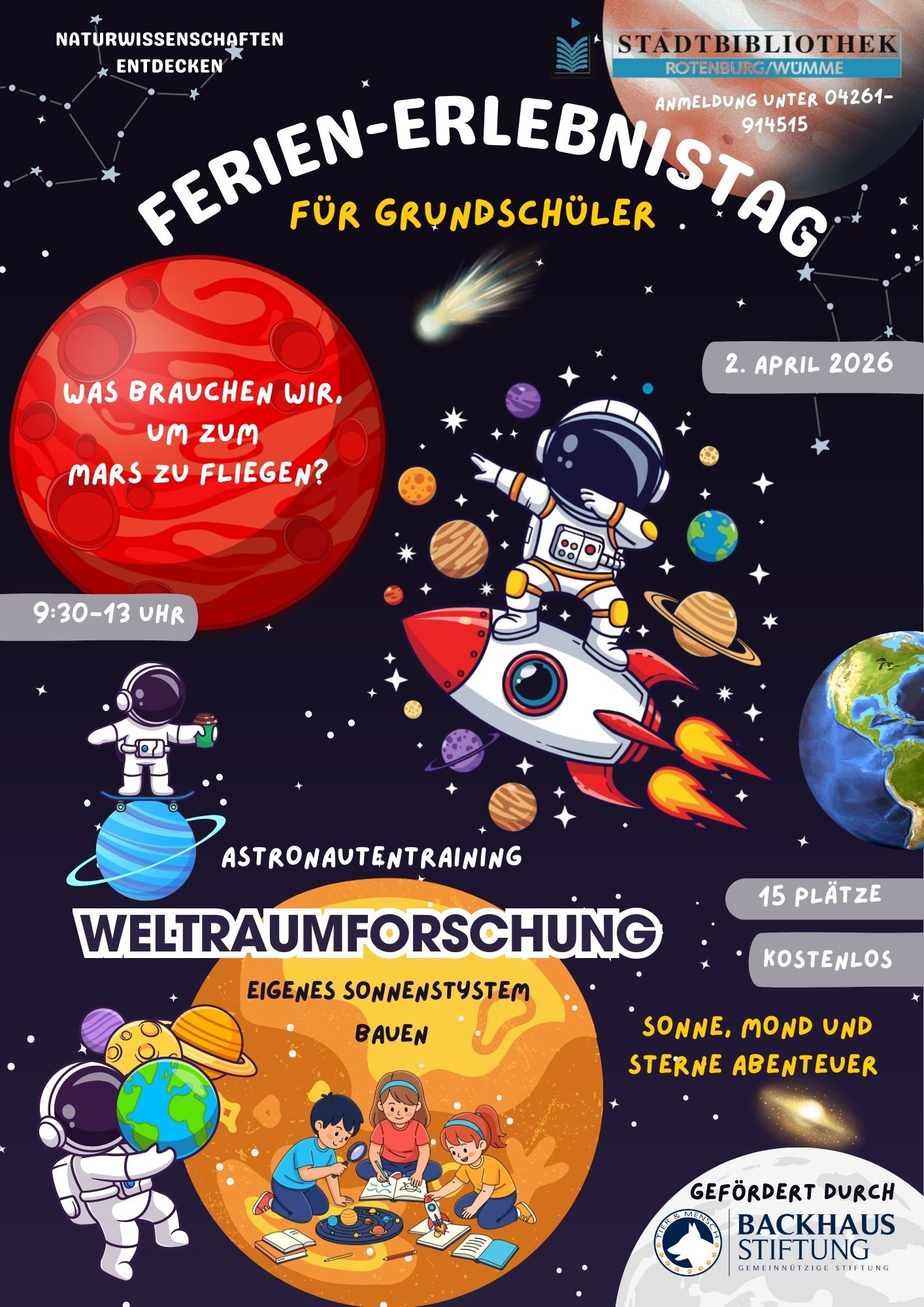 Und am 2. April verwandeln wir die Bibliothek in eine spannende 🚀🛰️🛸🔭 Weltraumstation. Dort basteln wir unser eigenes Sonnensystem 🔭🪐🌏 und führen ein Astronautentraining 🏋️♂️💪 durch. Beide Ferien-Erlebnistage sind kostenlos für Grundschüler.🎈