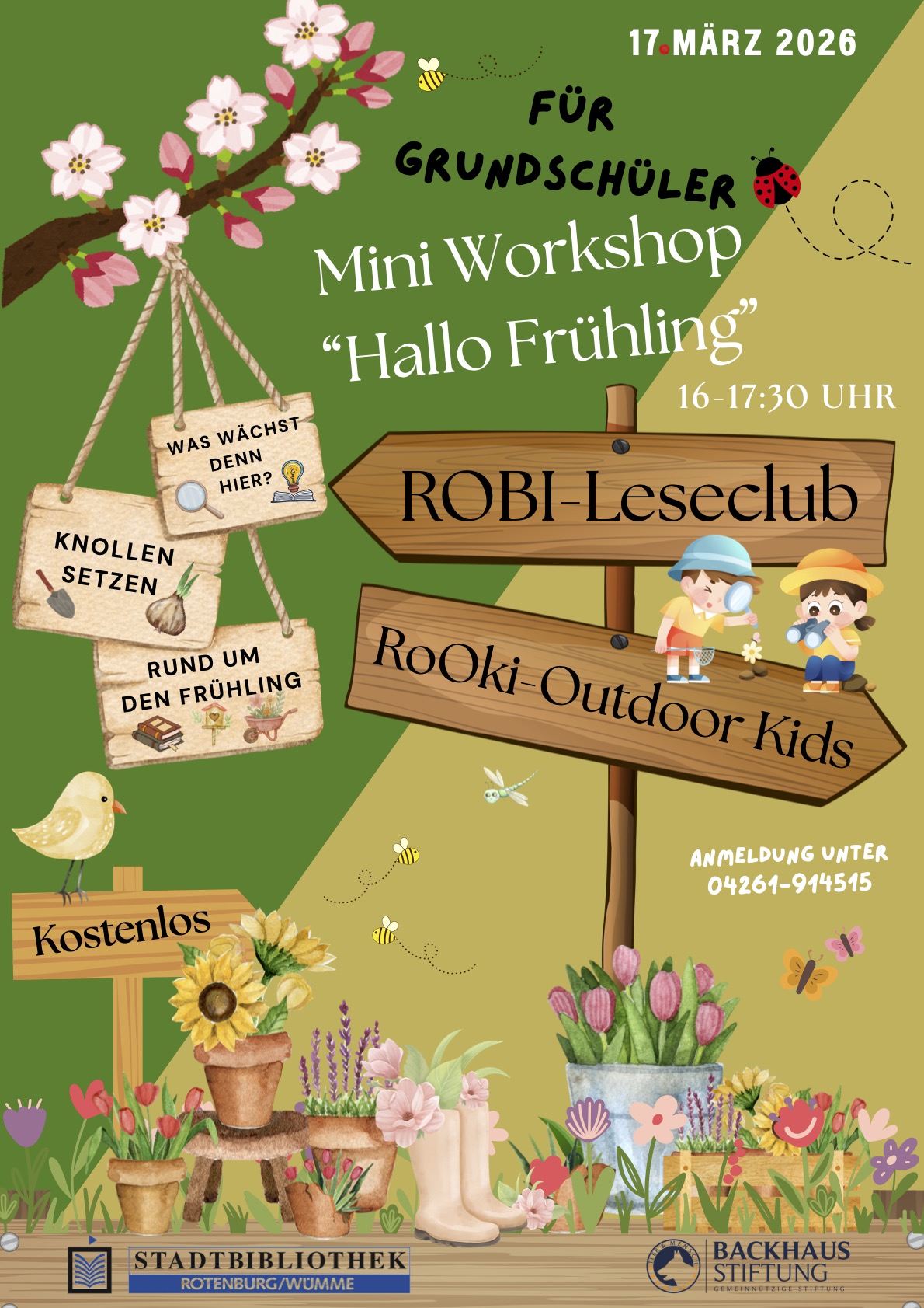 Im März dürfen sich unsere Grundschüler auf ein wundervolles Abenteuer zusätzlich 🌷🌼🥾 freuen! Am 17. März laden wir zu unserem Mini-Workshop „Hallo Frühling“ ein. Zusammen mit dem ROBI-Leseclub 📚 und den ROOKi-Outdoor Kids 🥾 werden wir die spannenden Geheimnisse des Frühlings 🌷🪱🐝 🪹enthüllen. Wir werden 🔍 erforschen, welche Pflanzen 🌱 hier blühen und welche Blumen in ihrer Pracht 🌼erstrahlen. Außerdem setzen wir mit unseren kleinen Entdeckern 📖🌱 Knollen rund um die Stadtbibliothek 🌼🌷🌱 und basteln 🌷🪴✂️📐ein schönes Erinnerungsstück für zu Hause.